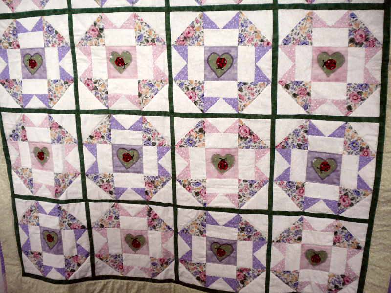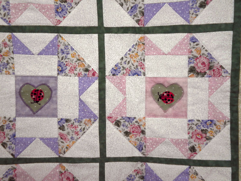 ![]() Mom wanted ladybugs - no, little flowers - no, hearts - in purple - no, pink - no, white. These appliqued heart-shaped ladybugs with pink, lavender, green, and white flowers are comfortably residing in Windsor, CO